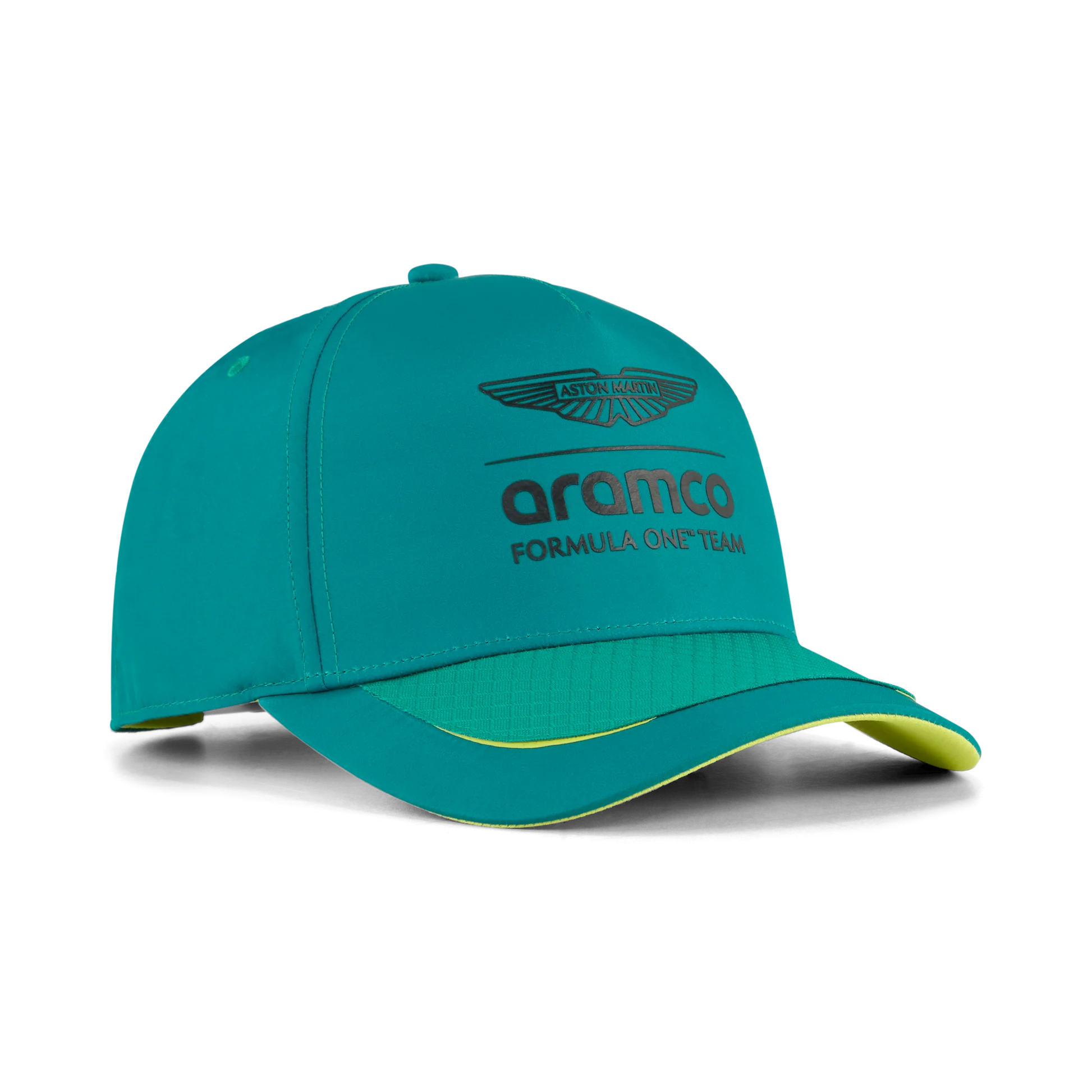 Official Team Branding: Features a crisp, high-definition print of the Aston Martin wings logo and the "Aramco Formula One Team" branding in contrast black on the crown.